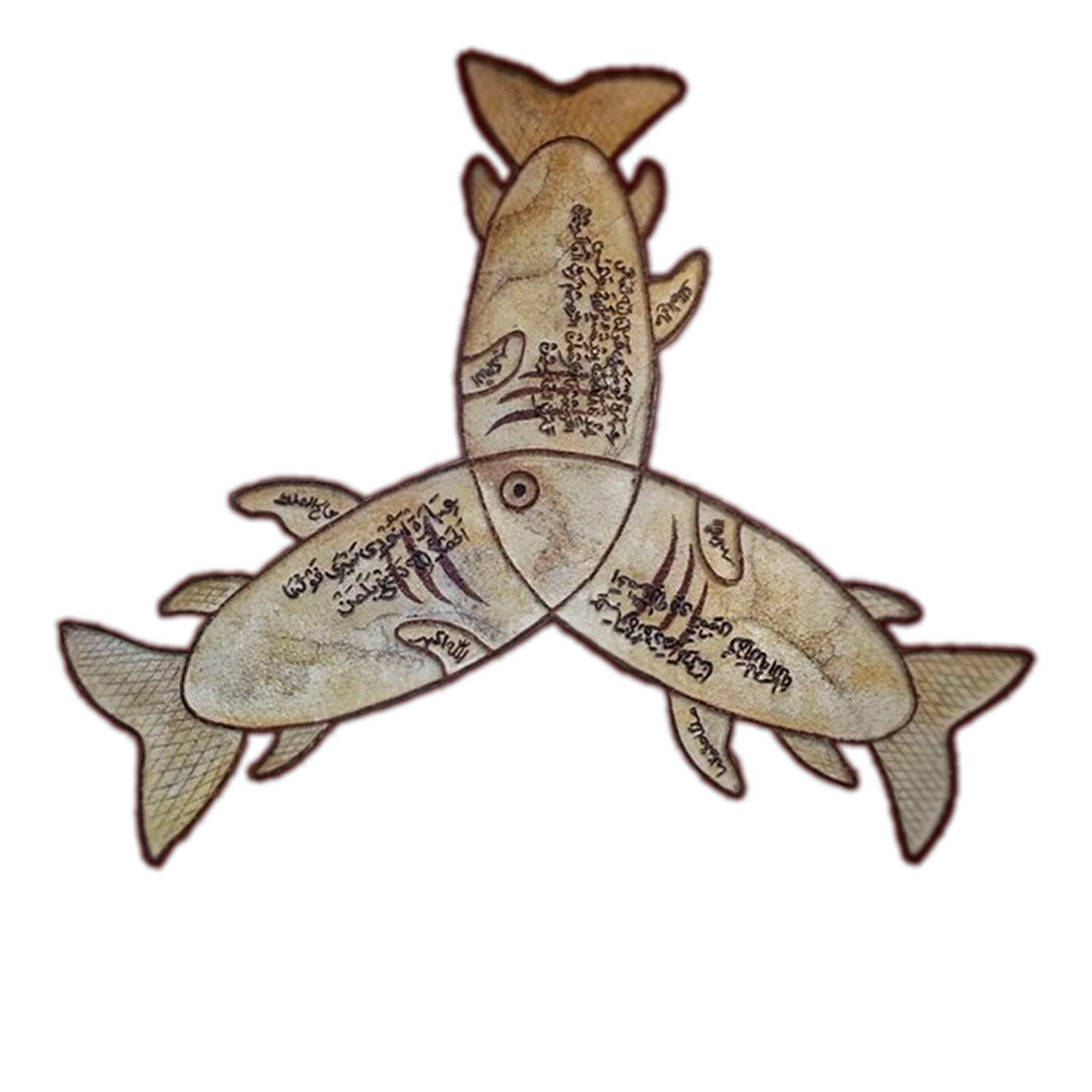 Arab Jawa-Pegon di tengah-tengah ketiga ikan. Inti dari tulisan itu menyatakan
